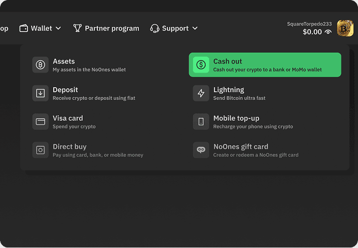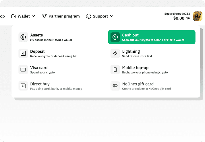 Log in to your NoOnes account and select "Cash out" from the Wallet menu
